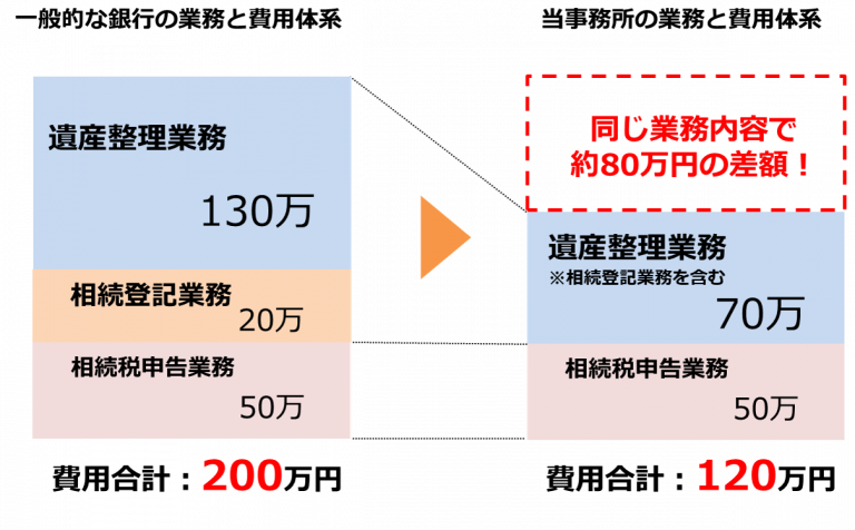 上記のとおり、同じ遺産整理業務でも銀行の業務ですと200万円かかってしまうことになります。