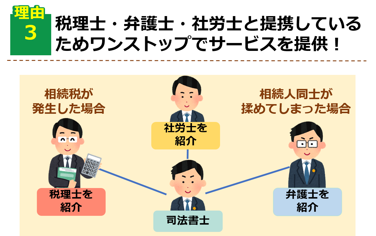 各士業と連携しているため、相続手続きをワンストップサポートします。