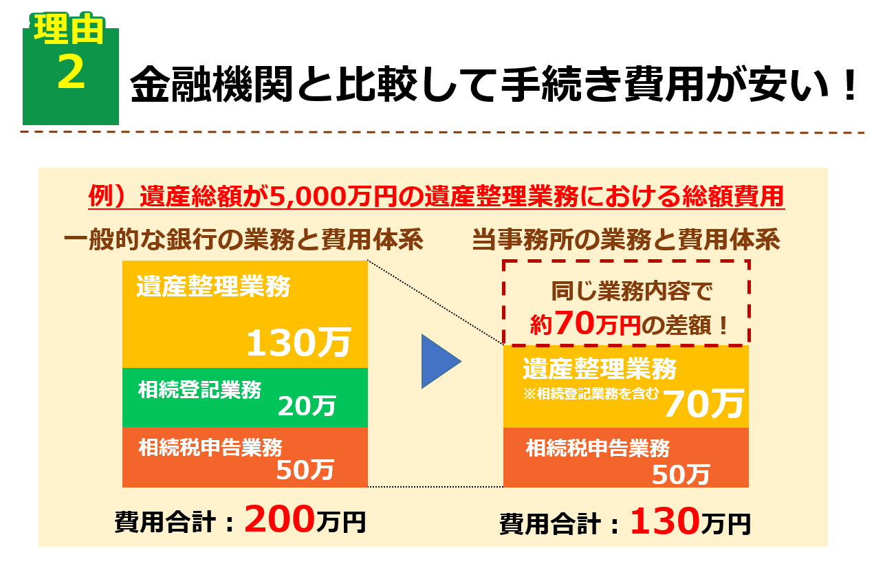 このように、当事務所にご依頼いただいた場合、業務内容は変わらないのに、不要な費用が掛からず、断然リーズナブルになります。