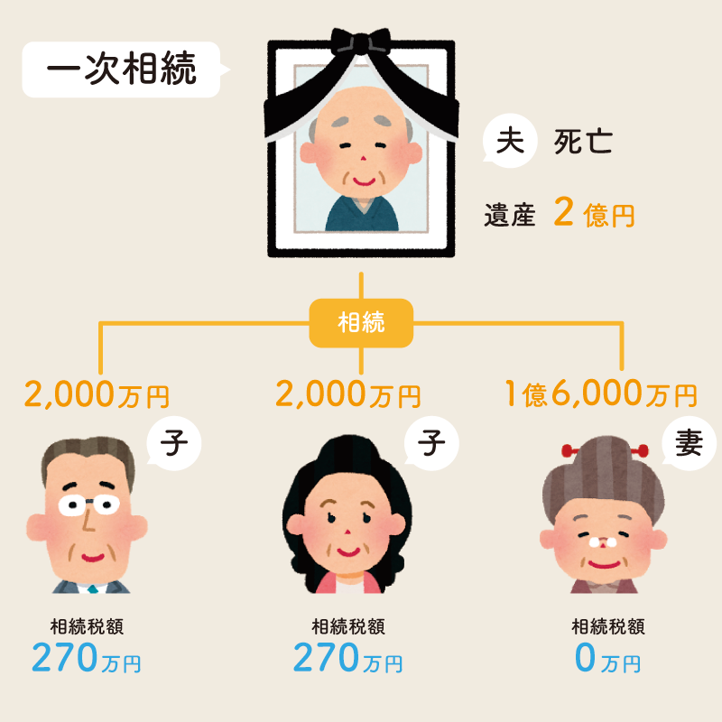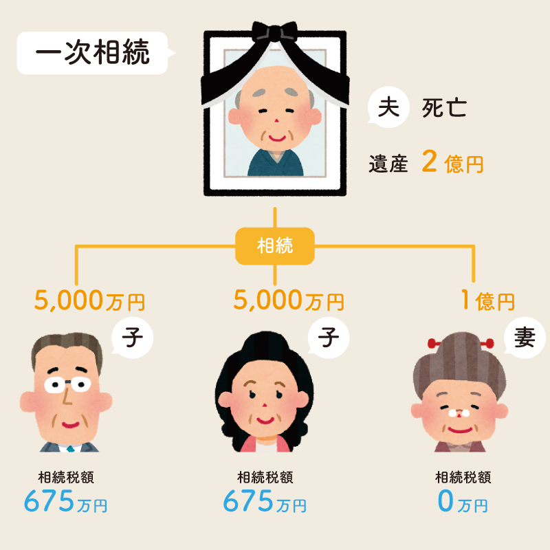 一次相続の相続人として配偶者と子供がいた場合、一次相続では配偶者が多く財産を受け取るようにして節税したつもりが、二次相続(配偶者から子供への相続)も含めると、相続税の総額が高くなってしまう、というケースが起こりうるのです。